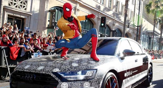 Sau đó, nam tài tử Tom Holland cũng đã đem A8 2018 đến với buổi công chiếu phim. Chiếc sedan được bọc kín bằng lớp dán decal tơ nhện, và Tom Holland đã xuất hiện trên mui xe với bộ đồ Spider-Man, khiến buổi công chiếu phim càng thêm náo nhiệt.