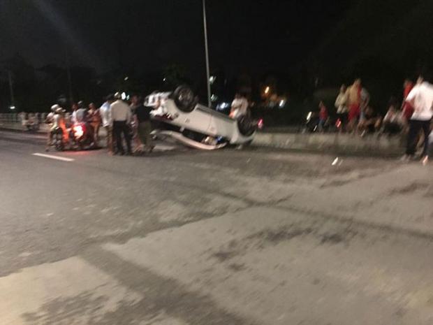 Cú va chạm khiến chiếc xe ô tô lật ngửa giữa đường. Thời điểm xảy ra tai nạn trên xe có 3 người (2 vợ chồng và cô con gái khoảng 5 tuổi).