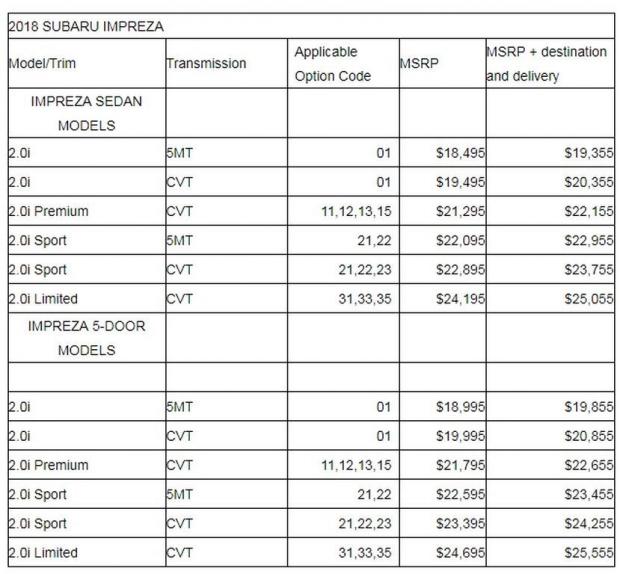 Với giá bán đắt hơn 100 USD (~ 22,7 triệu VNĐ) so với phiên bản xe năm ngoái, Subaru Impreza 2.0i 2018 cơ sở nhận được trang bị cửa sổ điện và ổ khóa điện, cùng hệ thống thông tin giải trí với màn hình cảm ứng 6.5 inch, có khả năng tương thích với Android Auto và Apple CarPlay.