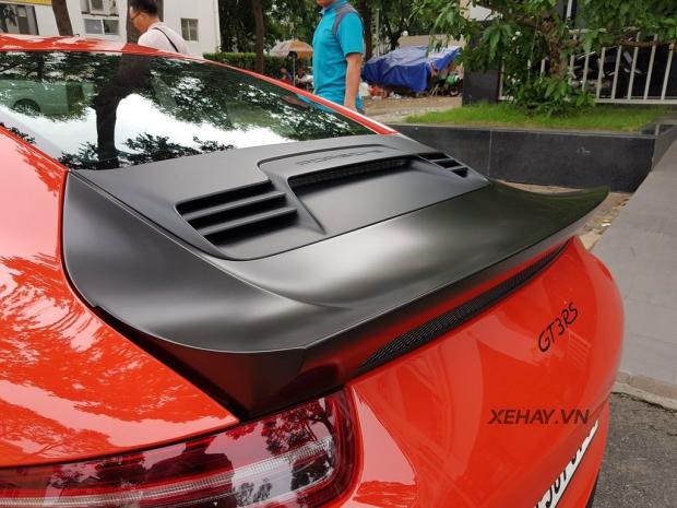 Điểm dễ dàng nhận ra chiếc 911 GT3 RS là phần cánh gió kích thước lớn. So với phiên bản GT3, GT3 RS mang thiết kế cánh gió sau mạnh mẽ hơn. Bên cạnh đó là thiết kế khung chống lật ở phía sau người lái, thay thế cho hàng ghế sau.