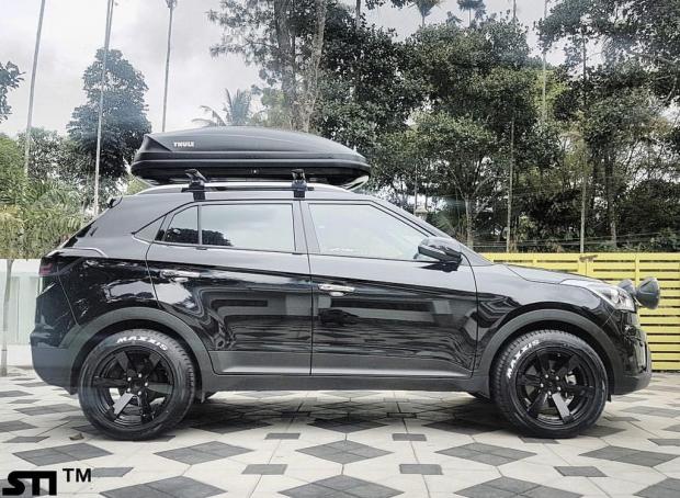Cụ thể, chiếc Hyundai Creta này được trang bị bộ la-zăng 6 chấu 17 inch được hoàn thành trong màu sơn đen bóng hợp tông với toàn bộ thân xe, các bánh xe được bọc gọn trong lốp chuyên dụng 235/55/17 Maxxis All terrain.