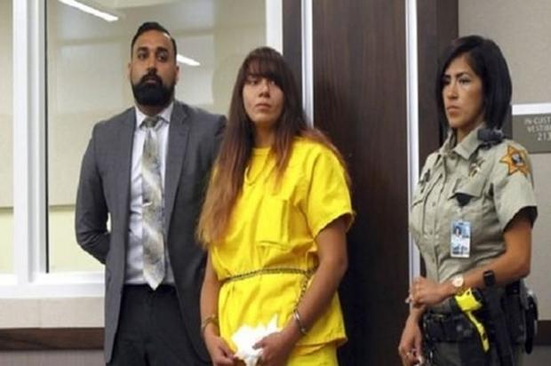 Trong bộ đồ tù nhân màu vàng, Obdulia Sanchez khóc nức nở khi ra tòa án hạt Merced hôm 28-7.