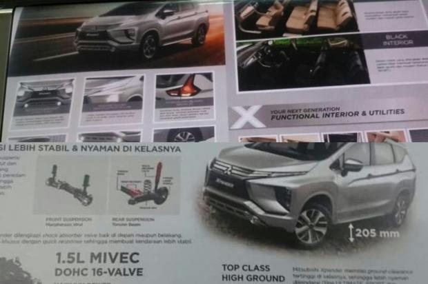 Theo tài liệu quảng cáo bị rò rỉ, Mitsubishi Xpander sẽ được trang bị dải đèn chạy ban ngày LED, bộ bánh xe hợp kim 16 inch, tay nắm cửa mạ crôm và đèn hậu LED hiện đại. Mitsubishi sẽ giới thiệu Xpander với cấu hình màu tông kép black-beige ở bên trong khoang cabin.