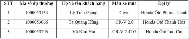 Lễ rút thăm trúng thưởng đã được tổ chức long trọng vào ngày 09/08/2017 tại Văn phòng đại diện Công ty Honda Việt Nam tại Hà Nội với sự tham dự của Đại diện khách hàng, Đại diện Đại lí và Đại diện Honda Việt Nam. Với giải thưởng cực kỳ giá trị là Honda Accord 2.4L nhập khẩu trực tiếp từ Thái Lan – mẫu xe cao cấp hạng D sở hữu sự nâng tầm của các yếu tố: “Thể thao hiện đại – Hứng khởi khi sử dụng” cùng trái tim là động cơ áp dụng công nghệ Earth Dreams Technology đột phá mang lại khả năng vận hành mạnh mẽ và mức tiêu hao nhiên liệu ấn tượng, buổi lễ rút thăm đã diễn ra trong không khí vô cùng hứng khởi và hồi hộp. Trong sự mong chờ của những người tham dự chương trình, đại diện khách hàng và các cơ quan đã lần lượt rút thăm và xác định được 3 khách hàng may mắn nhất trở thành chủ nhân của 3 chiếc Honda Accord trong tổng số 363 khách hàng tham gia chương trình từ ngày 01/07/2017 đến hết ngày 31/07/2017: