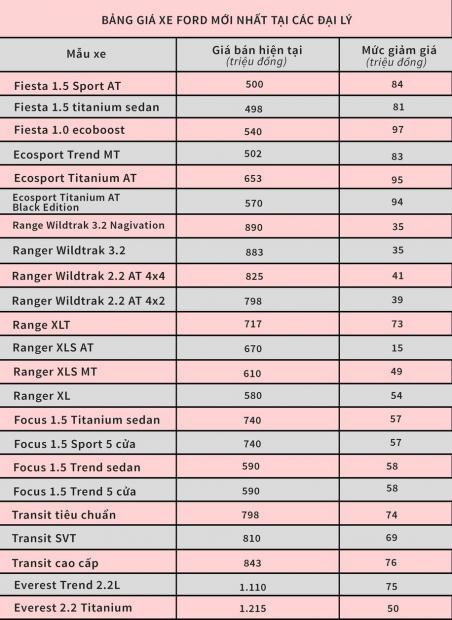 Dưới đây là bàng giá xe Ford cập nhật tháng 8/2017 tại Hà Nội: