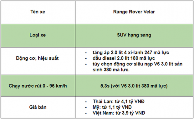 Trong khi đó, Range Rover Velar ở Thái Lan chỉ có duy nhất một lựa chọn động cơ là máy dầu 4 xi-lanh, tăng áp, dung tích 2.0 lít với công suất tối đa 180 mã lực. Sức mạnh được truyền tới cả 4 bánh thông qua hộp số tự động 8 cấp.