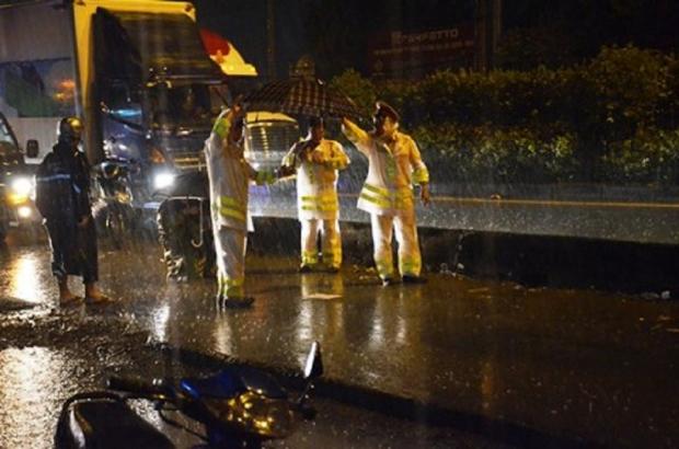 Lực lượng chức năng đội mưa xử lý vụ tai nạn