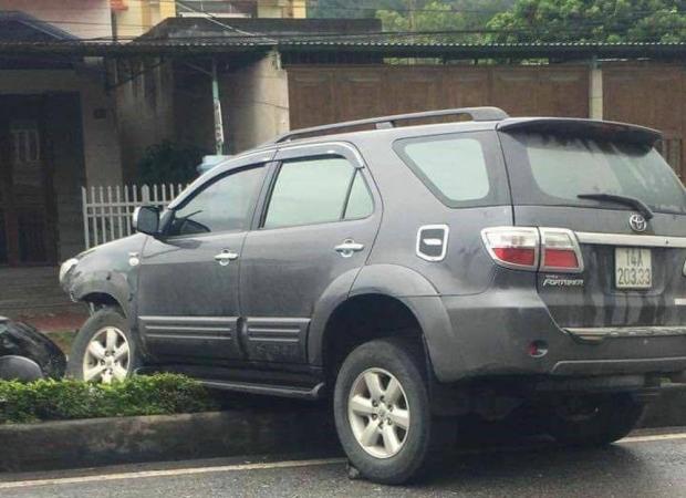 Hình ảnh cho thấy chiếc xe nằm ngang so với trục dải phân cách, phần đầu xe bị hư hỏng nặng, cản va của Toyota Fortuner vỡ nát và trục bánh trước có dấu hiệu bị gãy.