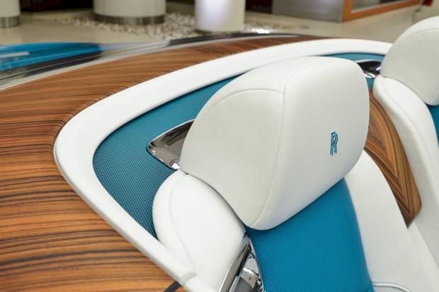 Chiếc Rolls-Royce Dawn lần này xuất hiện trong showroom ở Abu Dhabi có ngoại thất màu xanh lam ngọc bích kết hợp với màu bạc ở đầu xe, nắp ca-pô, đường vai và mui vải màu xám nhạt.