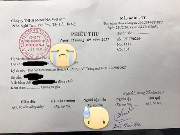 Đưa lên mạng xã hội Facebook câu chuyện mình đã đặt cọc mua Honda CR-V ở Honda Tây Hồ nhưng sau đó bị “xù” một cách trắng trợn, anh L.T.D kể: “Ngày 1-9-2017, khi có thông tin giảm giá xe, nhân viên bán hàng Lê Hoàng Đô có nhắn tin báo giá xe cho tôi. Ngay chiều hôm đó tôi đã sang làm hợp đồng mua bán với bên Honda Tây Hồ và đặt cọc tiền mua chiếc xe CR-V 2.4L trắng với giá 828 triệu đồng + 50 triệu đồng phụ kiện. Thời gian giao xe là ngày 27/09/2017 (vì để tránh tháng Ngâu). Tất cả đều được cam kết trên giấy trắng mực đen”.
