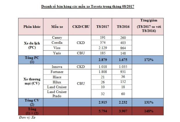 Trong tháng 8/2017, mẫu xe Vios tiếp tục dẫn đầu phân khúc với 2.129 xe được bán ra, tăng trưởng ấn tượng 146% so với tháng 8/2016, tiếp tục giữ vị trí dẫn đầu trong các mẫu xe bán chạy nhất trong tháng 8. Con số này chứng tỏ sức hút không hề thuyên giảm của thị trường xe sedan hạng nhỏ trung cấp tại Việt Nam. Hai mẫu xe còn lại là Camry và Corolla có doanh số lần lượt 191 và 374 xe.