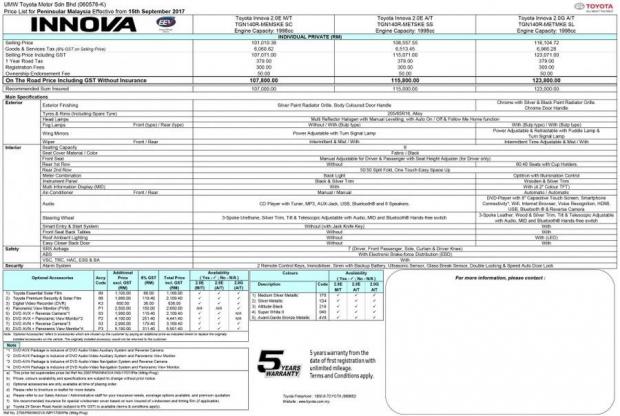 Giá bán của Toyota Innova cũng được sửa đổi một chút, trong đó 2.0E số sàn có giá bán 107.700 RM (~ 585 triệu VNĐ) (trước đó có giá 105.800 RM ~ 575 triệu VNĐ), 2.0E số tự động có giá 115.800 RM (~ 630 triệu VNĐ) (giá bán trước đó là 113.800 RM ~ 619 triệu VNĐ), và 2.0G số tự động có giá bán 123.800 RM (~ 673 triệu VNĐ) (giá cũ 122.400 RM ~ 665 triệu VNĐ).