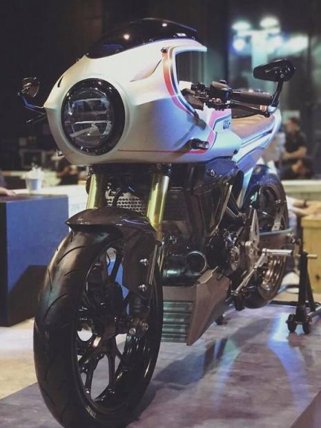 Bản độ gây ấn tượng tại sự kiện bởi chi tiết đặc trưng ở đầu xe. Dàn áo của xe được gắn liền với đèn pha, bao trùm lấy đèn pha hình tròn cổ điển và gương chiếu hậu gù, kết hợp với tay lái clip-on phong cách café racer thay thế cho tay lái nguyên bản, giúp xe mang một 'khuôn mặt' thú vị hơn.