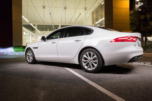 Nhìn từ bên hông, xe có trụ A cực dốc và nóc xe thuôn mượt, tạo nên kiểu dáng tổng thể gần giống một chiếc xe coupe thể thao. Khoảng cách từ trục bánh xe trước đến mũi xe rất ngắn và từ trục bánh xe sau đến đuôi xe rất dài giúp tạo ấn tượng tốc độ mãnh liệt, dù xe vẫn đang đứng yên. Phần đuôi xe của Jaguar XF sở hữu nhiều chi tiết lấy cảm hứng từ F-Type. Đó là cặp đèn hậu LED với dải đèn LED trang trí hình móc câu, là phần cốp xe với cách gió dạng đuôi vịt có thiết kế có chủ ý nhằm tối ưu lực ép xuống mặt đường và giảm lực cản không khí.