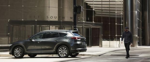Chiều dài của xe gia tăng kéo theo việc thiết kế các ô cửa sổ bên cũng khác hoàn toàn với CX-5 và CX-9. Ở phía sau, tấm chắn bùn và ống xả kép của xe cũng được thiết kế mới. Tuy nhiên, thiết kế phía sau của CX-8 vẫn bị ảnh hưởng nặng nề bởi CX-9 như thiết kế đèn hậu quen thuộc với một miếng crôm đặt chính giữa.