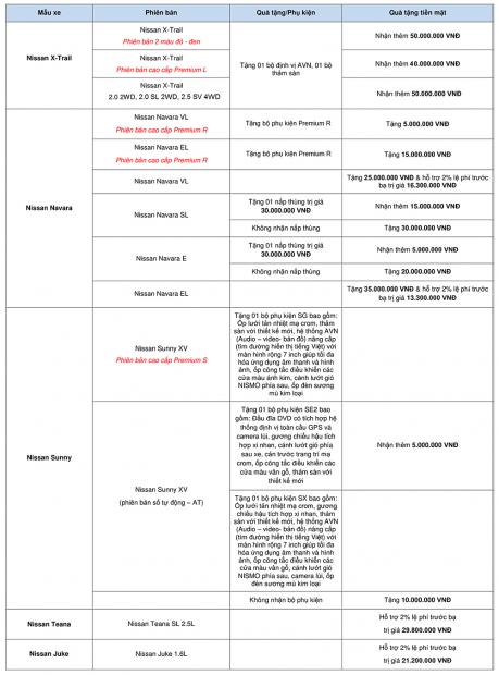 Trong tháng 9 này, Nissan Việt Nam thực hiện chương trình khuyến mại dành cho khách hàng mua xe X-Trail, Navara, Juke, Teana, Sunny và các phiên bản đặc biệt của X-Trail, Sunny và...