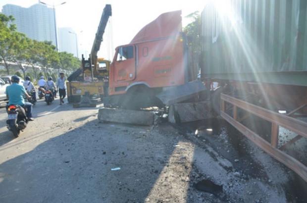 Vụ việc khiến nhiều khối bê tông bị húc văng, đẩy qua làn xe máy bể nát. May mắn, thời điểm xảy ra vụ việc làn xe máy ít phương tiện lưu thông nên không có người bị thương.