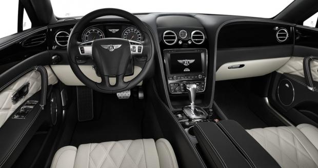 So với Flying Spur W12, bản V8 khác biệt ở cản trước, ống xả kép tạo hình số 8, logo chữ B được đặt trên nền đỏ là điểm dễ dàng nhận ra nhất. Flying Spur V8 được trang bị màn hình cảm ứng ở trung tâm bảng điều khiển, phía trên là cửa gió điều hòa và đồng hồ analog. Nội thất bọc da cao cấp, một số chi tiết ốp gỗ sang trọng, vô-lăng 4 chấu thể thao tích hợp nhiều phím chức năng.