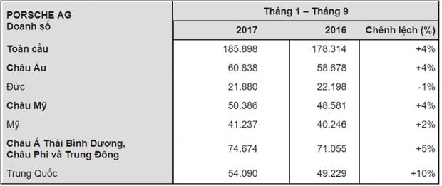 Tại châu Âu, Porsche đã giao được 60.838 xe (tăng 4%) trong ba quý đầu năm. Ở thị trường quê nhà tại Đức, tổng số 21.880 xe đã được giao cho khách hàng, gần bằng với mức doanh số cao của năm trước. Porsche cũng đã tiếp tục thành công ở thị trường Mỹ với 41.237 xe tương đương mức tăng trưởng 2%.