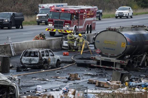 Va chạm đã thổi bùng ngọn lửa từ 2 xe chở nhiên liệu và nhanh chóng lan sang các xe khác, gây ra một đám cháy lớn thiêu rụi nhiều ô tô. Tai nạn nghiêm trọng khiến cả một đoạn đường cao tốc tê liệt trong nhiều giờ đồng hồ
