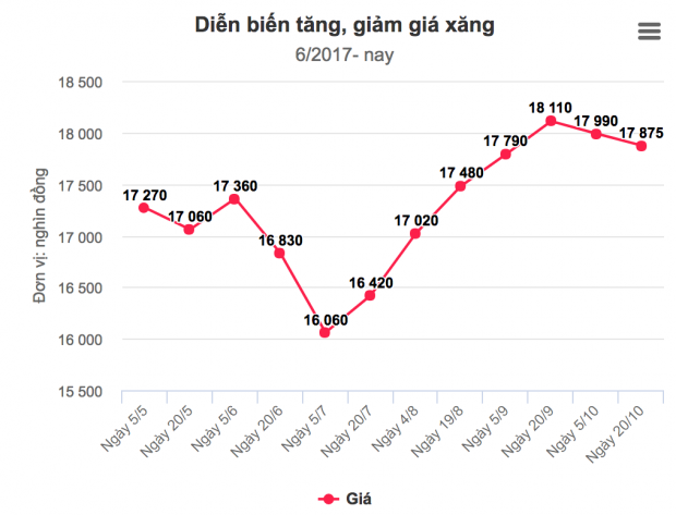 Tại kỳ điều hành ngày 20/10, giá xăng khoáng giảm 124 đồng một lít, về mức 17.875 đồng một lít, xăng E5 giảm 97 đồng một lít về 17.634 đồng một lít. Giá dầu diesel cũng giảm về mức giá mới 14.410 đồng, dầu hỏa là 12.999 đồng một lít