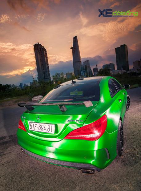 Đầu tiên là phần ngoại thất được dán decal màu xanh lá cực kỳ bắt mắt. Decal với bề mặt kiểu nhôm xước còn tạo nên những chi tiết lấp lánh khi nhìn ở một vài hướng sáng khác nhau, mà nếu sơn thì khó đạt được hiệu ứng này. Việc dán decal hiện cũng đang là trào lưu 'hot' ở Việt Nam.