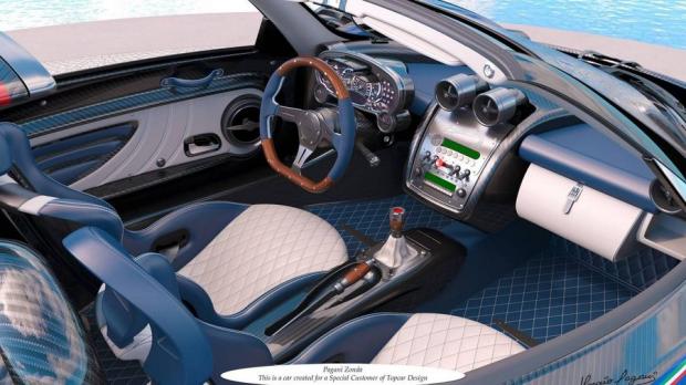 Mang logo của TopCar, Pagani Zonda mới được hoàn thành với một thân xe sợi carbon màu xanh lam kết với với các chi tiết trang trí theo màu sắc của cờ Ý và sọc dài hai bên có màu sắc phù hợp với các bánh xe.