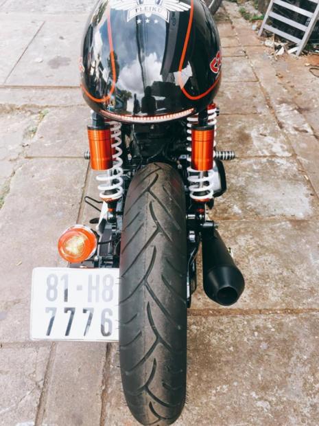 Nhìn từ phía sau xe, yên solo da bò được may bằng thủ công với chi tiết gù đặc trưng cafe racer tích hợp dải đèn LED, xi-nhan và stop khá ấn tương. Tuy nhiên, điểm đặc biệt hơn cả là chi tiết này còn là bình xăng của xe. Khi mới nhìn sơ qua bản độ này, chắc nhiều người không nhận ra và sẽ thắc mắc vị trí bình xăng của xe. Ngoài ra, giảm sóc sau cũng được thay thế bằng phuộc bình dầu Racingboy.