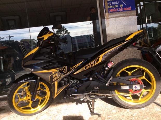 Khoác cho mình một phong cách đen chủ đạo kèm theo sự tô điểm nhỏ của một chút ánh vàng, kết hợp nhẹ nhàng cùng những món đồ chơi đã làm chiếc Exciter 150 này trở nên lạ mắt hơn và đẹp hơn.