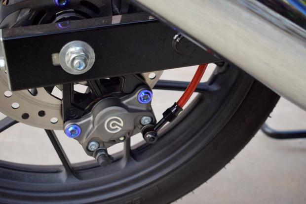 Nhìn xuống dàn chân ta sẽ thấy một bộ combo gồm dây dầu kiểu kết nối từ tay thắng dẫn dầu xuống đến heo dầu Brembo 4 pis đối xứng.