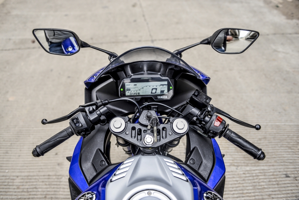 “Chất” thể thao tiếp tục được thể hiện ngay ở tư thế lái. Ở R15 V3 người lái sẽ phải cúi người hơn so với xe cũ. Tư thế vươn người về phía trước và ôm sát bình xăng là đặc trưng thường thấy ở những mẫu sport bike. Phần yên xe dốc về phía trước tuy có gây phiền toái khi đi tốc độ chậm nhưng nó trợ giúp tốt ở dải tốc độ cao. Tay lái dạng clip-on được đặt dưới chảng ba giúp kiểm soát tốt phần đầu xe khi người ngồi phải cúi sát người, giảm sức cản gió.