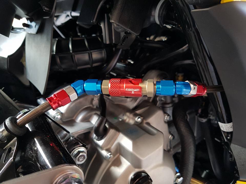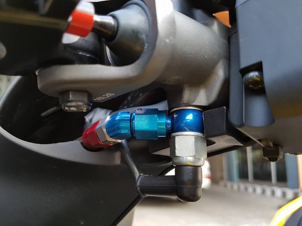 Dàn chân trước gợi cảm với phanh Brembo Billet 2pis đi kèm trọn bộ dây dầu Earl's+ ngắt dầu PSI.