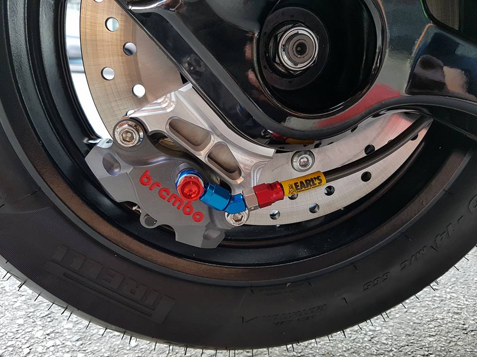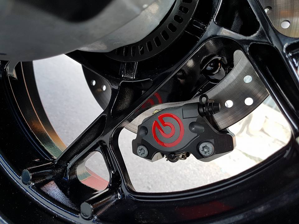Bộ phanh sau được hỗ trợ từ phanh Brembo Billet đi cùng pát CNC quay ngược và dây dầu Earl's.