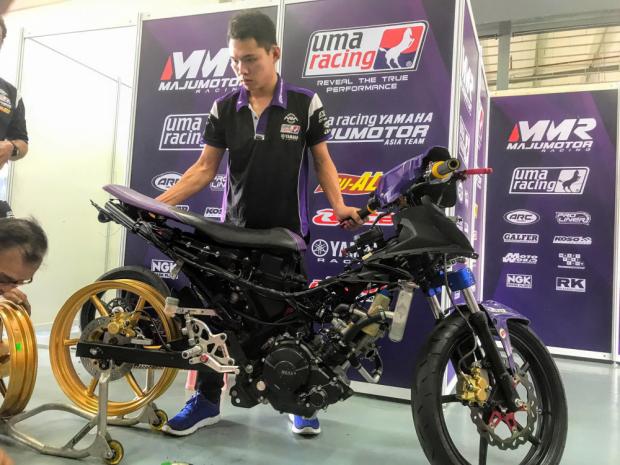 Yamaha Exciter 150 là mẫu underbone thể thao ở hạng 150cc của Yamaha. Dòng Exciter 150 cũng đại diện cho Yamaha thi đấu trong hệ thi đấu UB150 của giải đua ARRC 2018. Ở đây, chúng ta sẽ cùng soi chiếc Exciter 150 của đội đua Uma Racing sử dụng phuộc trước Winner 150.Cận cảnh Exciter 150 sử dụng phuộc trước Winner 150 của đội đua Uma Racing. Giải đua ARRC 2018 đang được các đội đua chạy thử để bước vào ngày đua chính thức. Ai cũng hiểu rõ và ngay cả đội đua chính thức cũng phải công nhận phuộc trước + chảng 3 của Exciter 150 rất yếu và không thỏa điều kiện sử dụng trong đường đua. Do đó, các đội đua đều sử dụng phuộc trước của Winner 150, chính xác hơn là của hãng KYB + chảng 3 CNC, tích hợp cả trợ lực tay lái.