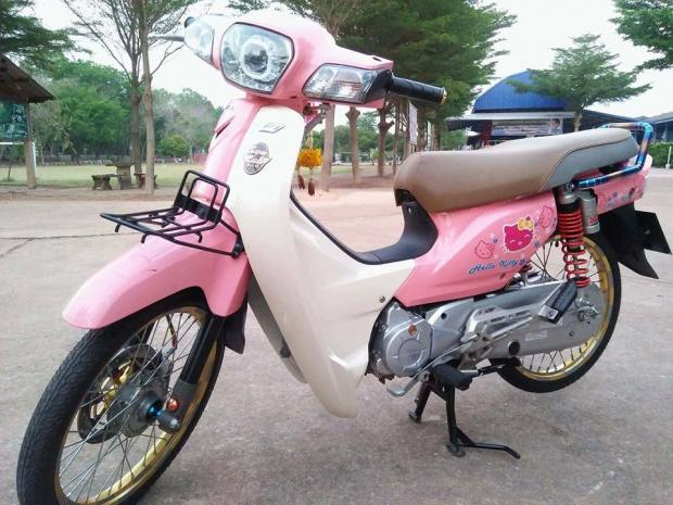 Nguồn : http://www.2banh.vn/threads/honda-cub-fi-do-dam-chat-banh-beo-voi-bo-canh-hello-kitty-dang-yeu.83585/Nguồn : http://www.2banh.vn/threads/honda-cub-fi-do-dam-chat-banh-beo-voi-bo-canh-hello-kitty-dang-yeu.83585/Xem qua tổng thể ta sẽ thấy 1 bầu trời hồng cực đẹp trên dàn áo được tạo điểm nhấn qua hình ảnh chú mèo Hello Kitty cực đáng yêu, nhân vật này rất được các bạn nữ yêu thích. Phía trước được trang bị rổ inox 3S siêu đẹp.