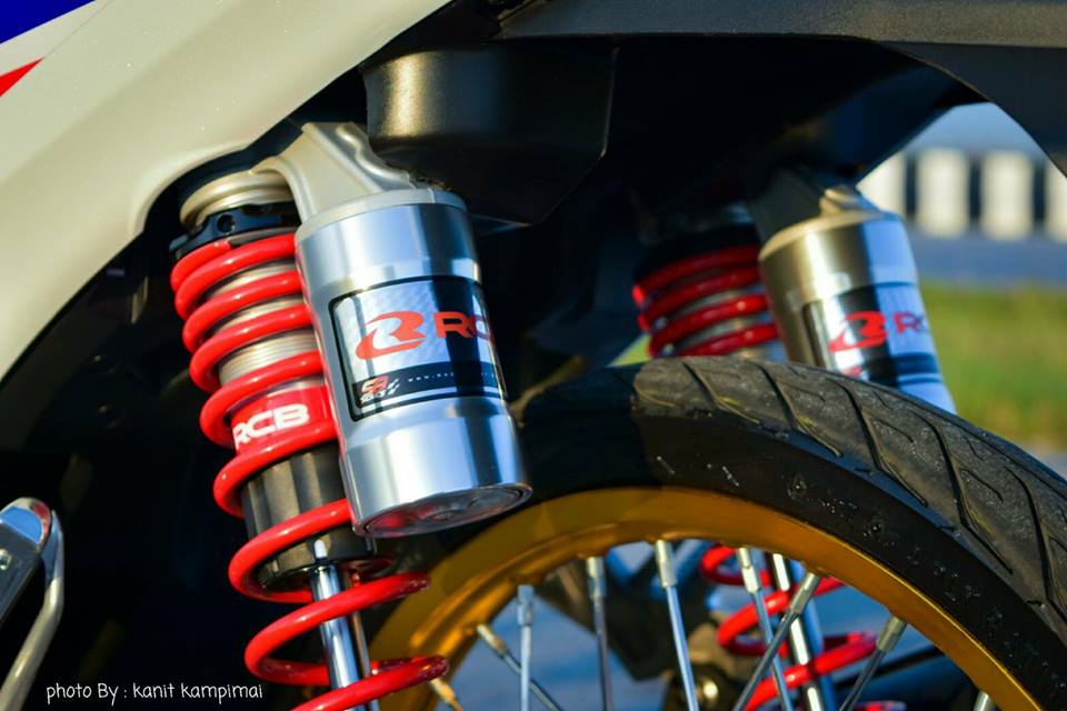 Phuộc Racing boy tích hợp bình dầu cho độ nhún êm ái hơn cũng như tăng độ cứng cáp cho xe với lò xo màu đỏ mang sắc thái mạnh mẽ.