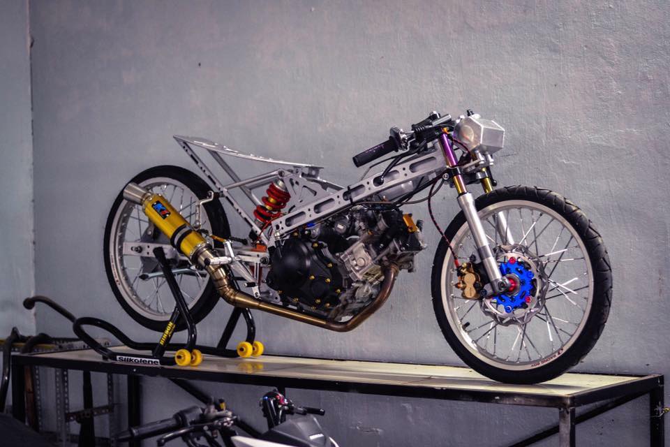 Sườn xe đến từ hãng chuyên làm sườn nhôm siêu nhẹ cho xe DRAG với thương hiệu J.R.P Thailand. Các chi tiết phần đi đông đã được hạ hết mức có thể để AE có thể dễ dàng núp gió khi vào những trận đua khốc liệt được tính bằng từng % giây.