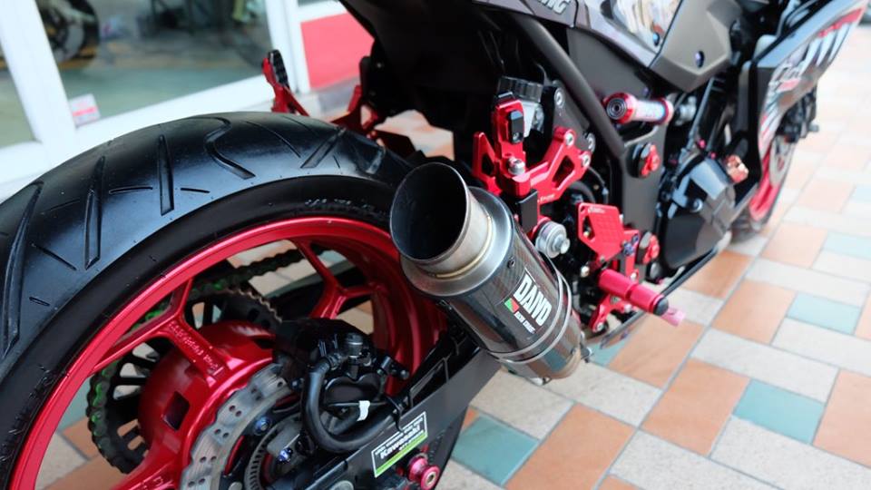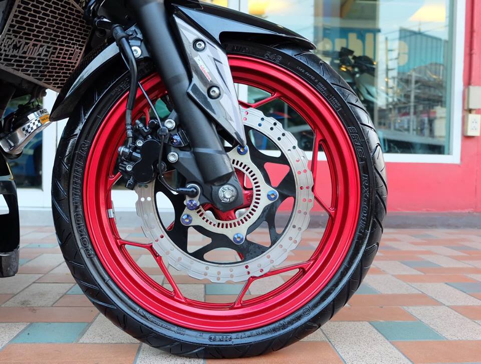Xe sử dụng bộ la-zăng kích thước 17 inch được sơn phối màu đỏ candy khá hot, phuộc trước dạng ống lồng, tích hợp chống bó cứng ABS.