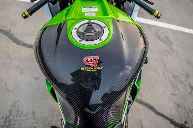 Ngay vị trí bình xăng là trang bị ốp Clever Wolf Racing được thiết kế từ vân Carbon đẹp mắt.