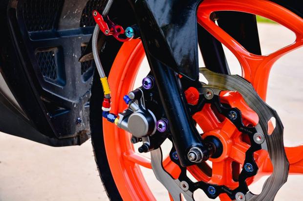 Dàn chân tạo cơ bắp với mâm Asio được sơn màu cam nổi bật , ở hệ thống phanh có vài chi tiết được thay đổi với đĩa Galfer được đính chặt bằng ốc Titan , dây dầu Earl's với đầu nối góc 45 độ đầy nghệ thuật .
