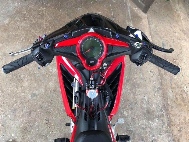 Dàn đầu xe độ là cả một vùng trời công nghệ với đồng hồ Koso Uma dành riêng cho Exciter 135 5 số, cặp cùm công tắc NVX bao tay Spider + gù dẹp CNC là những thay đổi nhỏ tạo sự mới lạ cho xe, tay thắng Brembo RCS + tay côn CRG Roll