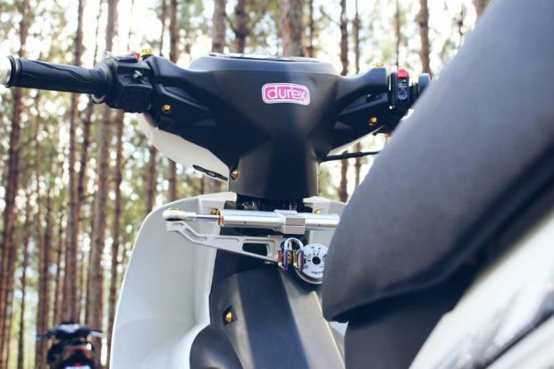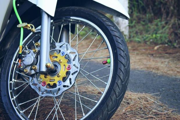 Dàn chân được trang bị dây dầu Morin xanh cùng hình ảnh của chú heo dầu kiểu Brembo, đĩa kiểu thái 220mm