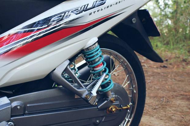 Phuộc Racingboy màu xanh biển hiệu mắt phía sau tăng cho xe độ cứng cáp cũng như lực nhún nhảy êm ái hơn khá nhiều so với giảm xóc zin nhỏ bé