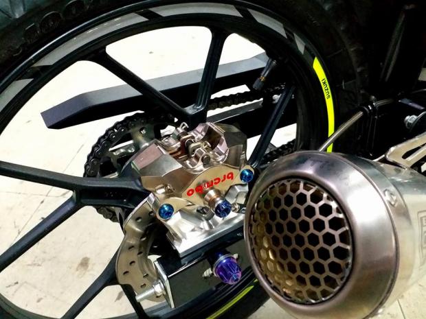 Phanh đĩa sau cũng được trang bị heo dầu Brembo Billet ( bộ pát CNC bắt heo này vừa có thể xoay lên cũng có thể xoay xuống tựa như PKL tùy theo sở thích chủ xe)