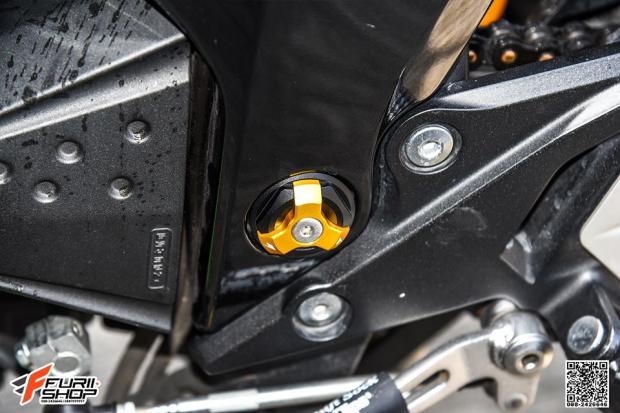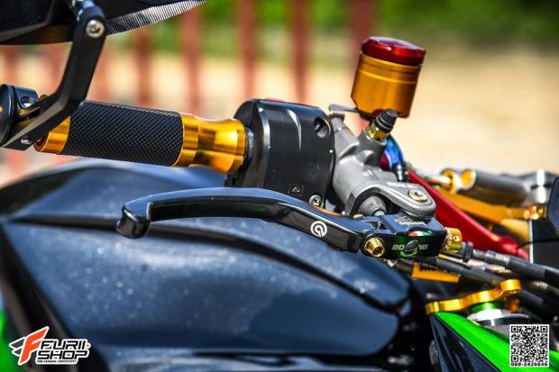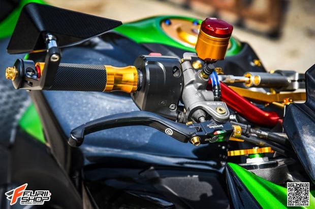 Ngoài ra chủ nhân còn sửa đổi bộ phanh brembo M4 ở trước và phanh Brembo Billet ở sau quay ngược theo phong cách Moto GP, hệ thống ống xả thay đổi nòng súng Akrapovic fullsystem. Và điểm đặc biệt cuối cùng là hỗ trợ việc tản nhiệt với két nhớt phụ nằm ngay dưới két nước lớn.