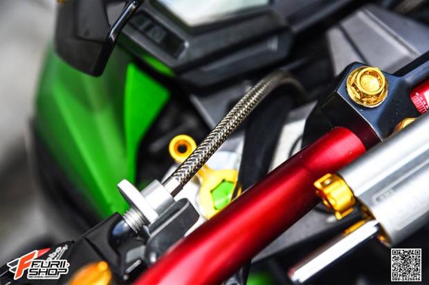 Ngoài ra cải thiện trọng lượng tay lái và độ ổn định ở tốc độ cao, chủ nhân đã thay đổi ghi-đông nhôm màu đỏ nổi bật, trợ lực Ohlins với nhiều nấc tăng chỉnh.