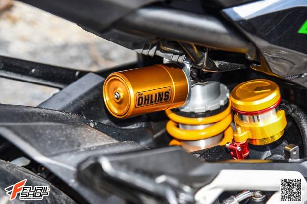 Đằng sau là hệ thống monoshock Ohlins bình dầu rời, hệ thống phanh sau được trang trí với bình dầu theo mẫu AZM đi kèm pát CNC màu đỏ nổi trội.