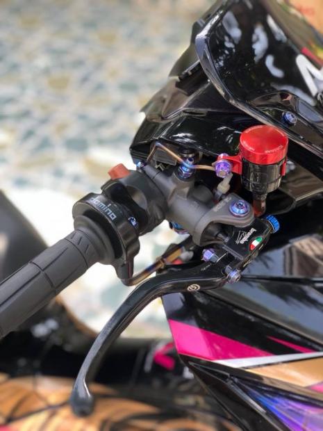 Cùm tay thắng Brembo RCS 19 tích hợp ổ chứa dầu rời Evotech, cùm tăng tốc Domino một dây cùng ống ga Titanium giúp xe tăng tốc nhanh hơn do hành trình ga được rút gắng