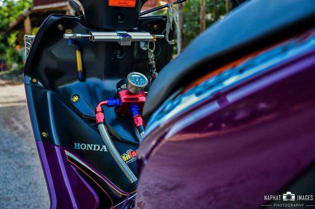 Dàn chân siêu mỏng là cách chơi ưa thích của biker Thailand, chúng ta có thể thấy cặp bánh mỏng manh tạo điểm nhấn với niềng nhôm màu hồng, hệ thống phanh được nâng cấp với đĩa moto3 kết hợp cùng heo Brembo billet & dây dầu Earl's. Việc thay đổi như thế này không chỉ tăng độ kiểng cho xe mà ở hệ thống phanh sẽ có độ tối ưu hơn khi xử lí các tình huống.