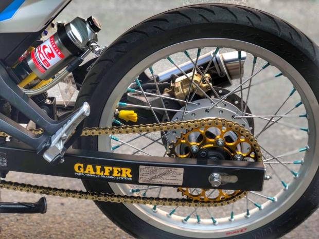 Dàn chân sử dụng niềng nhôm Raingboy cùng chân căm Osaki xanh Nitron khá lạ mắt, pô R9 thon gọn uy lực hơn khá nhiều so với pô zin bị ếm hơi